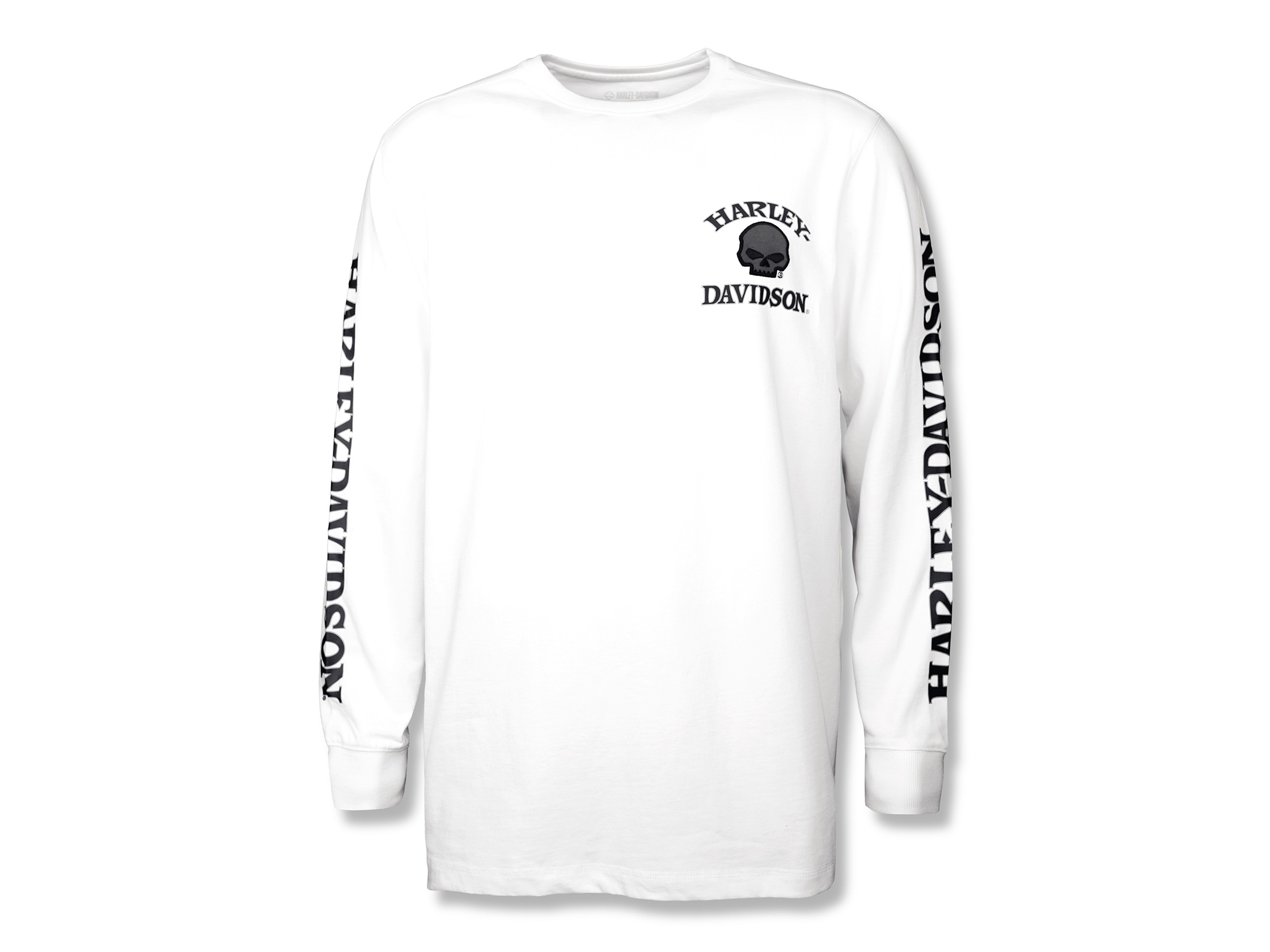 Bequem, auffällig, legendär ... Das Willie G" Skull Long Sleeve T-Shirt ist all das. Gefertigt in entspannter Passform aus superweichem Jersey aus Baumwolle und mit einen Halsausschnitt und Bündchen mit Rippstrick versehen, um die Form zu halten. Dieses Langarm-T-Shirt für Herren begeistert mit dem furchtlosen Willie G Skull sowie unserem doppelten Logoschriftzug auf den Ärmeln. Kleine Geschichtslektion: Obwohl der Skull eine seiner bekanntesten Kreationen ist, hat Willie G. Davidson auch mehrere Motorräder entworfen, darunter die 1971er FX Super Glide® und die 1977er FXS Low Rider®.