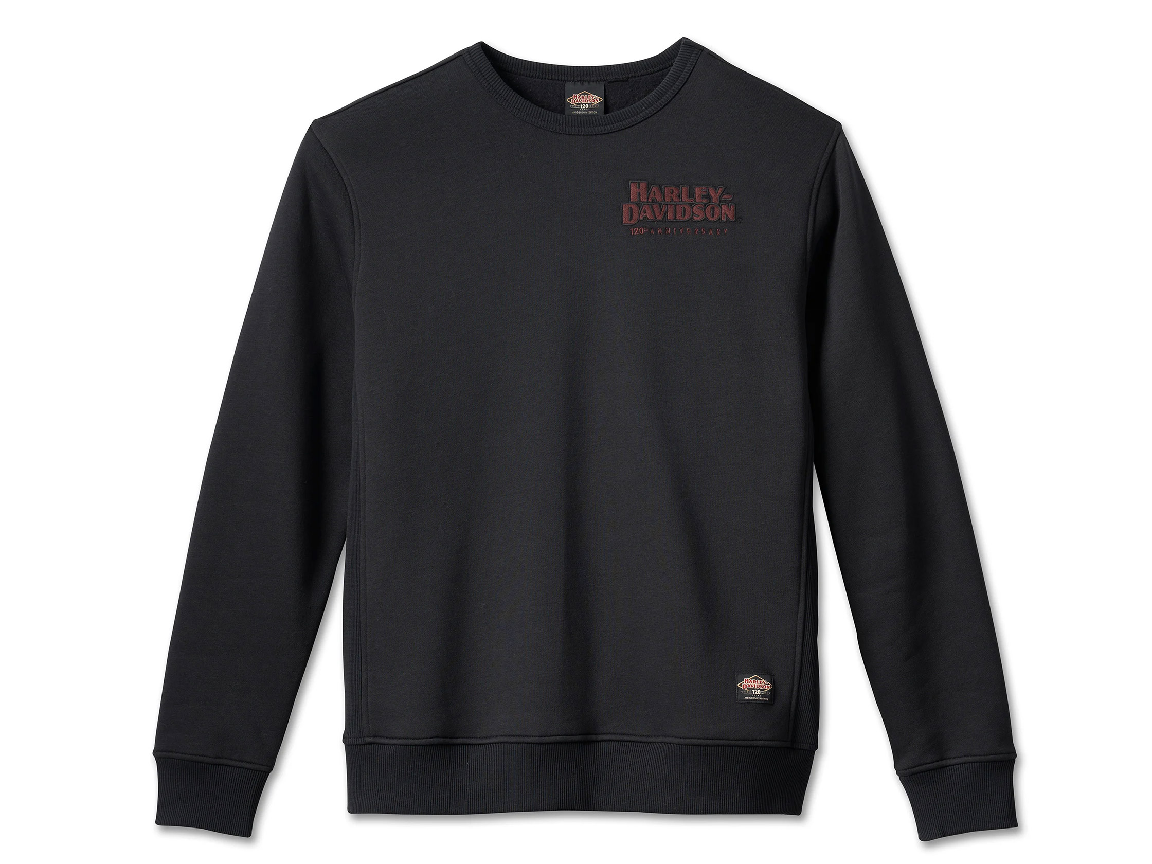 Das 120th Anniversary Sweatshirt steht für Komfort, der unser Erbe feiert. Sein warmes Fleece aus Baumwolle und Polyester ist der perfekte Begleiter für kalte Tage, während die Rippstrickdetails für Kontrast und Elastizität sorgen. Das Branding zu Ehren von 120 Jahren Harley-Davidson ist auf der Vorderseite dezent und auf der Rückseite groß zu sehen.