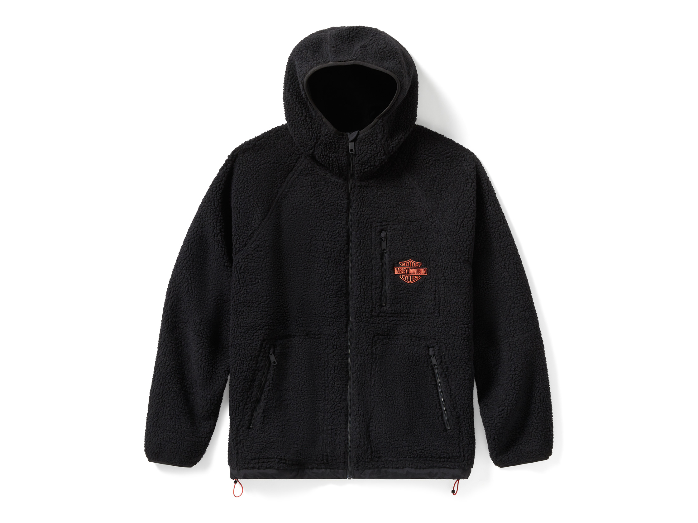 Mit dem Harley-Davidson® Sherpa Full Zip bleibst Du warm und dem Moto-Style treu. Gefertigt aus flauschigem, schwerem Sherpa aus Polyester mit elastischen Gummi-Kordeln am Saum, an den Ärmelbündchen und am Kapuzenrand, damit Du auch bei kühlen Temperaturen nicht ins Frieren kommst. Diese äußere Schicht für Herren verfügt über geräumige Reißverschlusstaschen zur Aufbewahrung wichtiger Utensilien sowie kontrastierende Ärmeleinsätze für einen edlen Look. Minimalistisches Branding mit einem gestickten Bar & Shield auf der Vorderseite.