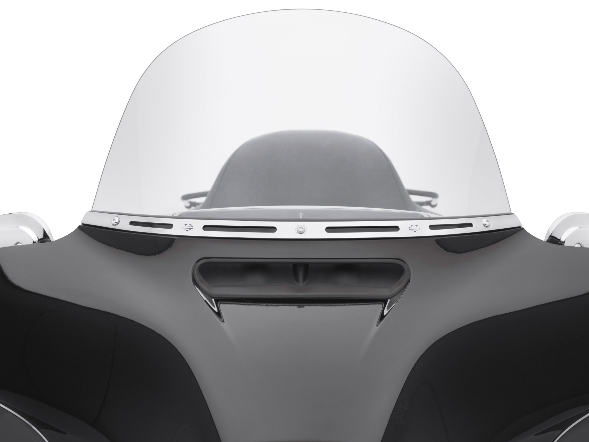 D i ese Wi n d sc h u t zsc h e i b e nve r k l e i d u n g aus hochglanzpoliertem Edelstahl weist vier Schlitze auf, durch welche die Farbe der Außenverkleidung sichtbar ist. Dieses einmalige Verkleidungsteil ziert ein Bar & Shield Logo, das in die Oberfläche eingefräst ist. Kit inklusive Montageteilen aus Edelstahl.