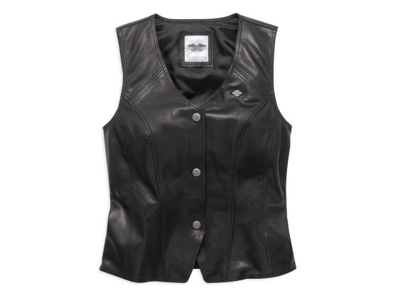 Leichtes Ziegenleder. Polyester-Twillfutter. V-Ausschnitt mit Druckknöpfen. Metall-Logo auf linker Brust. Ohne Rückenaufdruck.