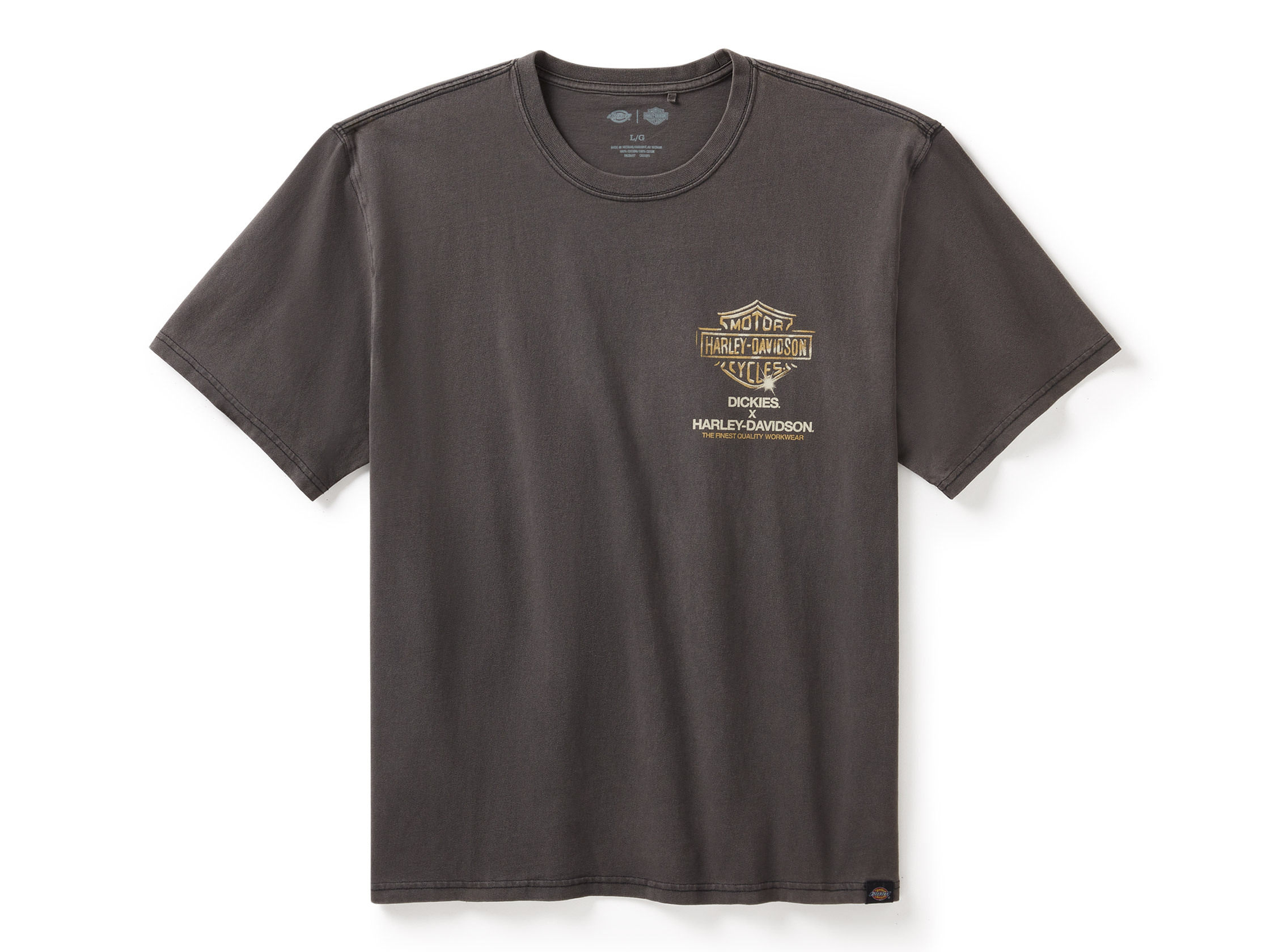Das Dickies® x H-D® Heavyweight Flaming Eagle T-Shirt ist die perfekte Mischung aus auffälligem Stil und lang anhaltendem Tragekomfort. Es ist in entspannter Passform aus robustem, schwerem Jersey aus Baumwolle gefertigt und wurde einer schweren Pigmentwaschung unterzogen, die für eine einzigartige Farb- und Schattierungsvariation und einen getragenen Look sorgt. Das auffällige Artwork auf dem Rücken zeigt zwei bekannte Branding-Motive: den Adler für Harley-Davidson und das Hufeisen von Dickies. Teil der Dickies® x H-D®-Collaboration - einer Sonderedition, bei der legendäre Arbeitskleidung auf legendäre Motorradkultur trifft.
