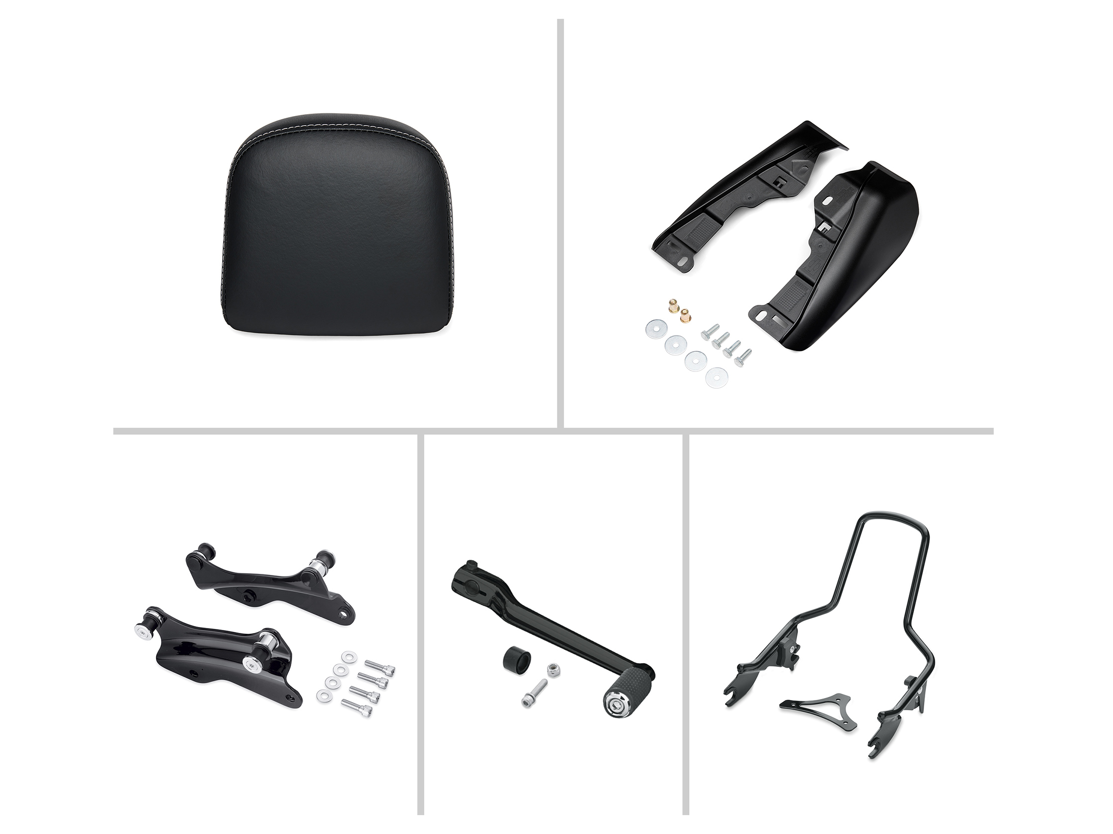 Enthält: H-D Detachables" Sissy Bar Bügel, Kompaktes Leder-Soziusrückenpolster, 4-Punkt-Montagekit, Fersenschalthebel, Mittelrahmen-Windabweiser. Das Paket kann weitere hier nicht abgebildete Komponenten enthalten.