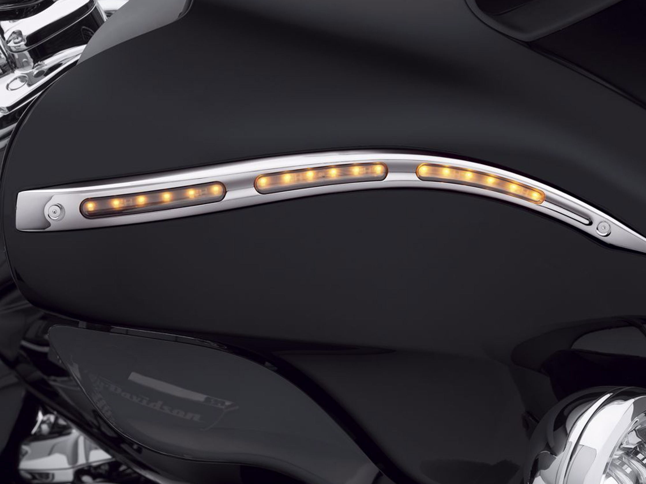 Die geschwungene Verzierung verleiht der Electra Glide Batwing-Verkleidung ein markantes, funktionelles Aussehen. Die konturnahe Zierleiste und das getönte Glas tragen LED Leuchten, die bei eingeschalteter Zündung weiß als Lauflicht leuchten und bei aktiviertem Blinker als orangefarbene Blinkrichtungsanzeige funktionieren. Die Verkabelung liegt für ein makelloses Custom-Design unsichtbar innerhalb der Verkleidung. Kit inklusive Montageschablone und aller erforderlichen Einbau- und Befestigungsteile. Die Verkleidung kann bei einigen Modellen Zierstreifen oder zweifarbige Zierlinien verdecken. Überprüfen Sie dies vor dem Einbau.